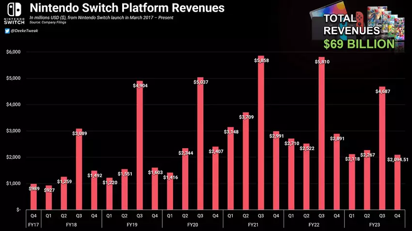 Uit analyses van TweakTown.com bleek duidelijk dat de inkomsten van het bedrijf uit de verkoop van apparaten en games de 69 miljard dollar hebben overschreden sinds de lancering van de eerste Nintendo Switch-consoles in maart 2017!