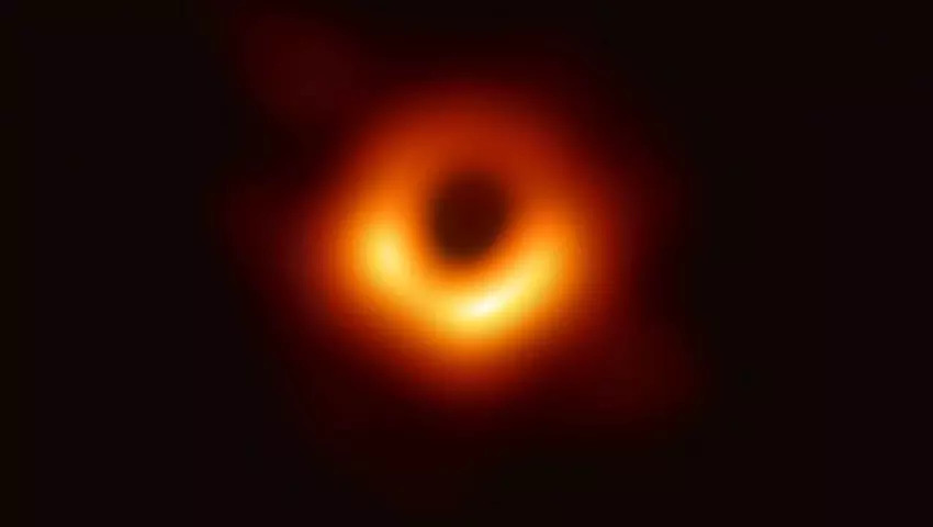 Als materie in het zwarte gat valt, verdampt het en verandert het in plasma. De schijf plasma rond het superzware zwarte gat is op de foto te zien als een ring. De computer heeft hem oranje gekleurd.