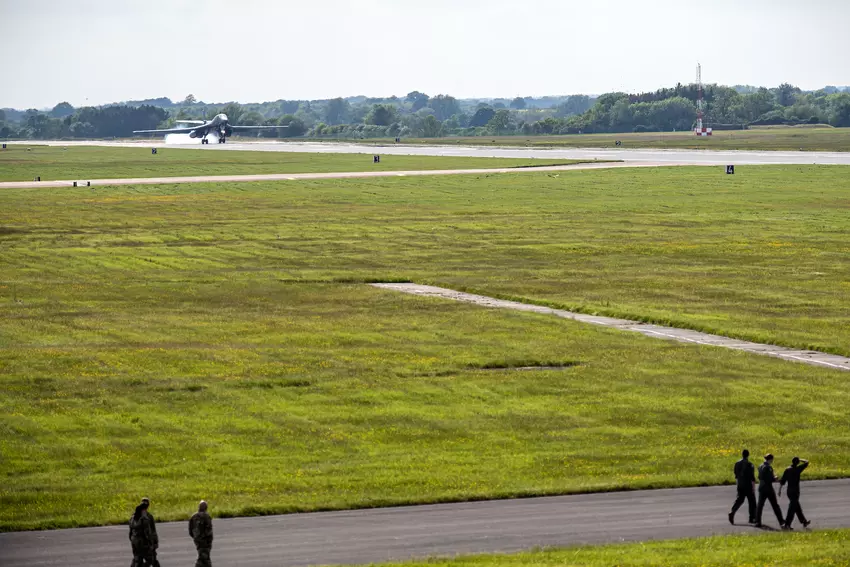 De B-1B Lancer landde op de Britse Royal Air Force basis Fairford. Ze zullen worden vergezeld door nog twee vliegtuigen voor de missie van de bomber task force. Zij zullen morgen, 25 mei, in de regio aankomen.