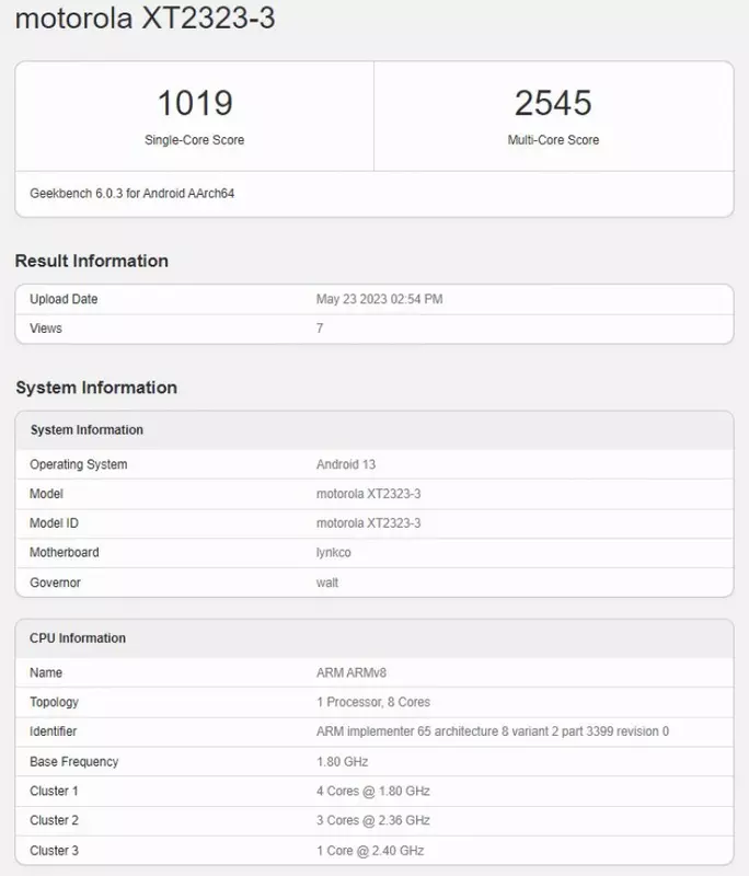 Helaas zijn er geen andere details over de smartphone op Geekbench, maar wat wel bekend is, is dat de gadget ook zal komen met twee displays: een primair display en een kleine secundaire aan de buitenkant. De Motorola Razr 40 zal ook een dubbele hoofdcamera krijgen. Overigens zal de noviteit samen met het topmodel Motorola Razr 40 Ultra onthuld worden.