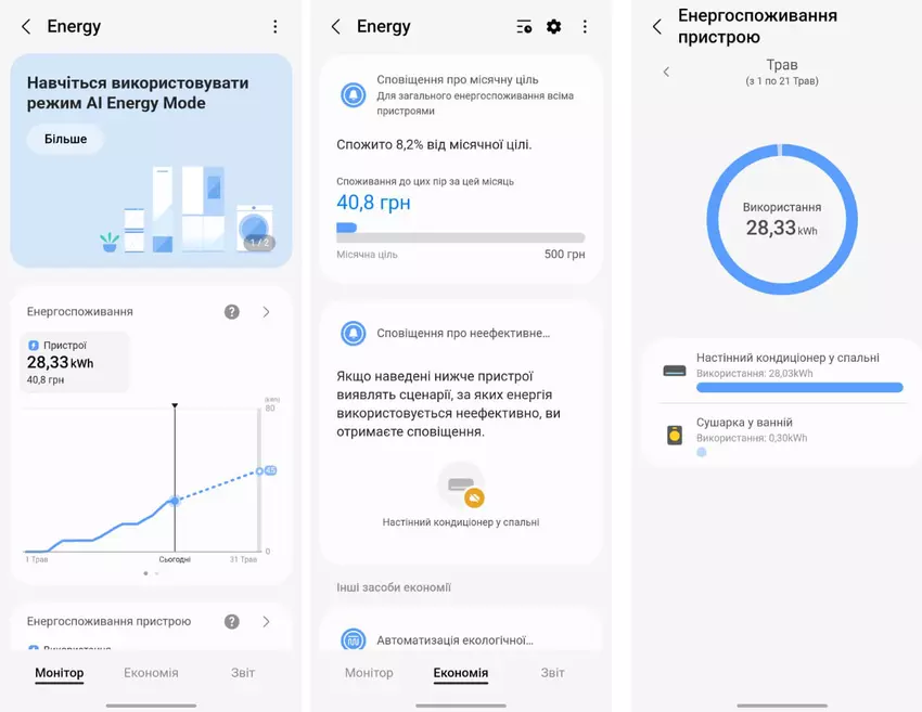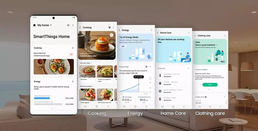 Een ander voorbeeld is de Samsung slimme airconditioner serie WindFree. In eerste instantie lijkt het erop dat de app alleen de mogelijkheden van de afstandsbediening dupliceert: hiermee kun je het apparaat in- en uitschakelen, de werkingsmodi aanpassen en de temperatuur in huis veranderen. Maar met de app kun je ook de werkingsmodi wijzigen volgens een weekschema, meldingen ontvangen en de airconditioner inschakelen als je het huis nadert (Welcome Cooling), en aanbevolen scenario's inschakelen om energie te besparen als er niemand thuis is. Op die manier kan een slimme balans worden bereikt waarbij geen elektriciteit wordt verspild en de airconditioner kan worden ingeschakeld voordat de gebruiker de kamer binnenkomt.