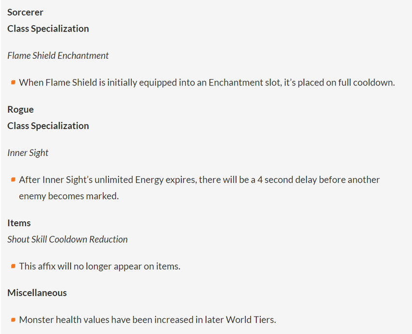 Onder de veranderingen, die in de onderstaande lijst volledig worden onthuld, zijn ook veranderingen aan Sorcerer's Flame Shield, dat nu volledig regenereert nadat het in een speciale sleuf is gebruikt: