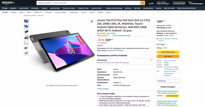 We hebben het over de Lenovo Tab M10 Plus (3rd Gen). Hij is verkrijgbaar in één kleur en in een 4/64GB uitvoering. De gadget kost 159,00 € 167,00 €, -5%.