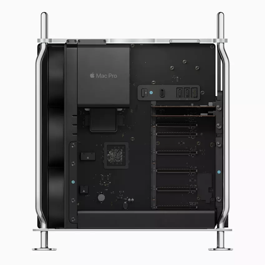 Hij heeft ook twee keer zoveel Thunderbolt 4-poorten - maar liefst acht. Hij ondersteunt tot zes Pro Display XDR's, plus Wi-Fi 6E en Bluetooth 5.3 voor snelle draadloze connectiviteit. Daarnaast zijn er 3 USB-A-poorten, 2 HDMI-poorten met hogere bandbreedte die een resolutie tot 8K en framerates tot 240 Hz ondersteunen, 2 10 Gbps Ethernet-poorten en een koptelefoonaansluiting. De Mac Pro heeft zes open PCIe Gen 4-uitbreidingskaartsleuven.