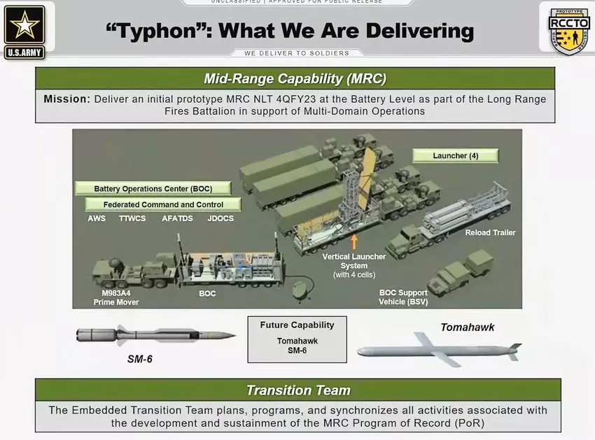 Het Amerikaanse leger wil vier wapensystemen die worden ontwikkeld in het kader van het MRC-programma. Typhon zal een vrije band innemen tussen de ATACMS / PrSM raketten, die een lanceerbereik hebben van 300 / 500 km, en hypersonische wapens. Het leger is van plan om SM-6 en Tomahawk raketten te krijgen onder contract bij de marine.