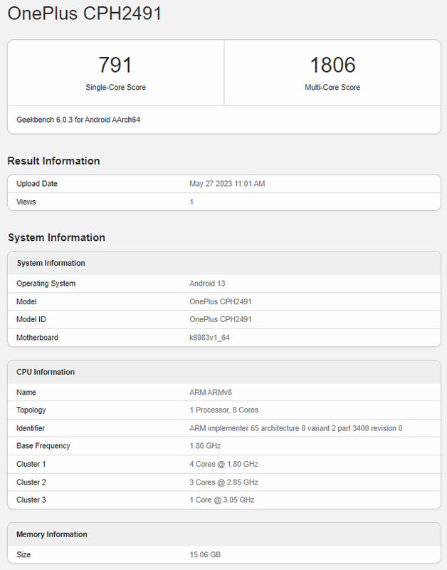 Andere specificaties van de OnePlus Nord 3 5G zijn niet beschikbaar in de Geekbench-database, maar als we de geruchten mogen geloven, krijgt de nieuweling ook een AMOLED-scherm met een diagonaal van 6,74 inch, een resolutie van 1,5 inch en een beeldverversingssnelheid van 120 Hz. Het apparaat krijgt een 50 MP + 8 MP + 2 MP primaire camera, een enkele 16 MP frontcamera en een 5000 mAh batterij met 80W opladen.
