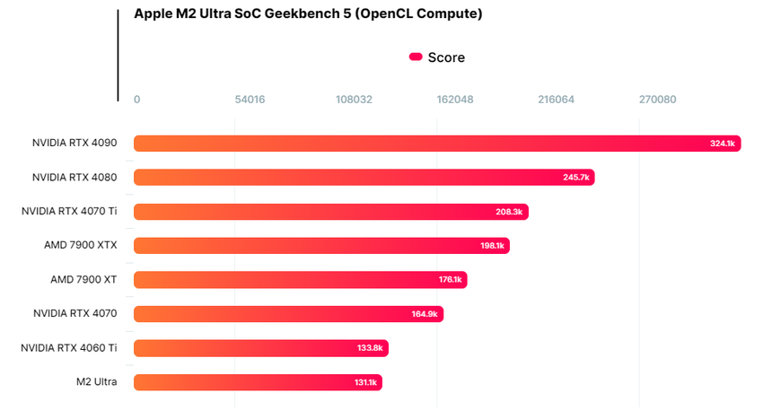 In Geekbench 5 (OpenCL Compute) wist de M2 Ultra 131.100 punten te scoren. Dat is een score op gelijke hoogte met de GeForce RTX 4060 Ti. De krachtigere RTX 4070 grafische kaart scoort ongeveer 34.000 punten meer. Als het gaat om NVIDIA's vlaggenschipmodellen, scoort de RTX 4080 meer dan 245.000 punten en de RTX 4090 meer dan 324.000 punten.
