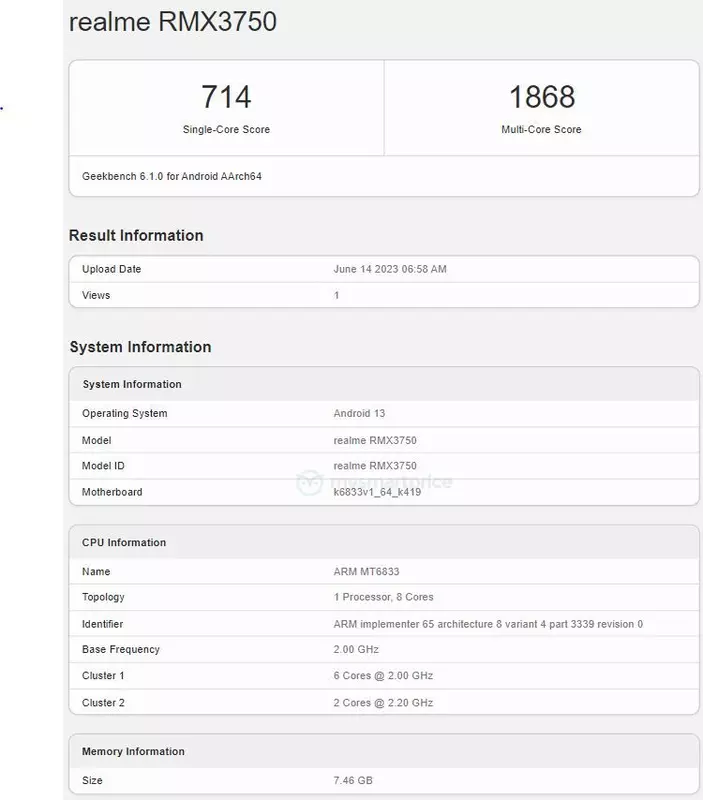 Een van de modellen uit de nieuwe serie is gespot in de Geekbench prestatietestdatabase. We hebben het over de Realme Narzo 60 met modelnummer RMX3750. Volgens het lek wordt de gadget aangedreven door een achtkernige MediaTek Dimensity 6020-processor. Daarnaast krijgt de nieuweling 8GB RAM en het Android 13 besturingssysteem uit de doos.