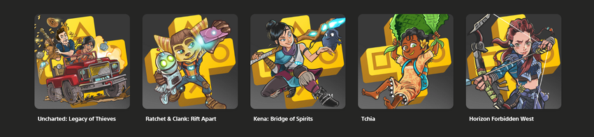 Op elk van de avatars staan PlayStation-personages afgebeeld wiens games beschikbaar zijn in de Extra- en Deluxe-bibliotheken. Bijvoorbeeld Eloy uit Horizon, Ratchet en Clank uit de gelijknamige gameserie, Kena uit Kena: Bridge of Spirits, Nathan Drake en Chloe uit Uncharted en een meisje uit Tchia.