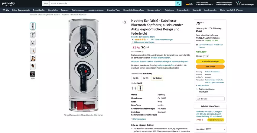 Amazon Prime Day 2023: TWS koptelefoon Nothing Ear (stick) met 33% korting