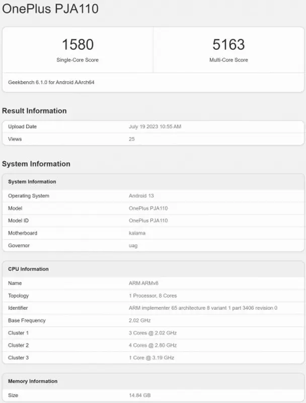 De smartphone heeft de prestatietest in Geekbench 6.1 al doorstaan. Het resultaat in Single-Core en Multi-Core was respectievelijk 1580 en 5163 punten. Volgens de database is het model uitgerust met 16GB RAM, Snapdragon 8 Gen 2-chip en draait het Android 13-besturingssysteem.