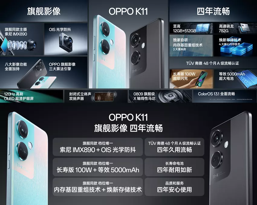 De nieuwigheid heeft de naam OPPO K11 gekregen. De gadget krijgt een 6,7-inch display met een gat voor de frontcamera. Het paneel heeft een resolutie van FHD+ en een verversingssnelheid van 120 Hz. Het apparaat wordt aangedreven door een Qualcomm Snapdragon 782G-processor en wordt gevoed door een 5000 mAh batterij. Het beschikt over 100W snellaadondersteuning. De gadget laadt op van 0 tot 50 procent in 10 minuten en tot 100 procent in 26 minuten.