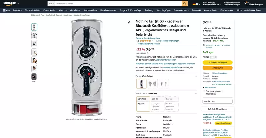 Nothing Ear (stick) op Amazon: TWS-hoofdtelefoon met transparant ontwerp, IP54-bescherming en tot 29 uur batterijduur voor 79 euro (39 euro korting)