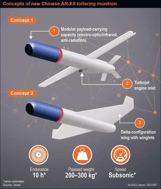 De publicatie Janes publiceerde een afbeelding waarop twee versies van de zelfmoorddrone te zien zijn. De eerste lijkt op de Amerikaanse Switchblade 300, en de tweede versie lijkt op de Iraanse ontwikkeling Shahed-136.