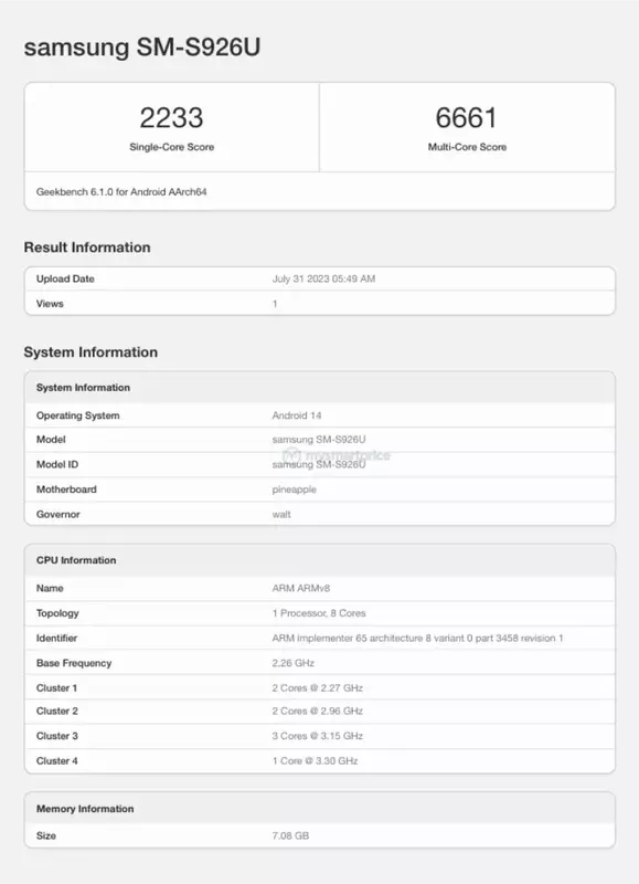 De versie met 8GB RAM en Android 14 besturingssysteem slaagde voor de prestatietest. De Snapdragon 8 Gen 3 heeft drie clusters van elk twee cores op 2,27GHz, 2,96GHz en 3,15GHz, en één Prime core op 3,3GHz.