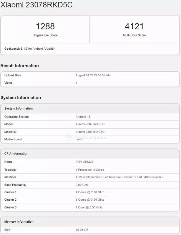 De nieuwigheid wordt in de documenten vermeld met het modelnummer 23078RKD5C. Volgens het rapport zal de gadget draaien op een MediaTek-processor met de codenaam Corot en een maximale kloksnelheid van 3,35 GHz. We hebben het over de vlaggenschipchip Dimensity 9200+.
