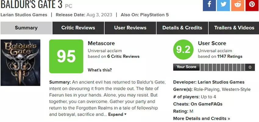 Vanwege het feit dat Larian Studios besloot om journalisten het spel niet voor de release te geven en vanwege de kolossale omvang van het project, zijn critici nu pas begonnen met het publiceren van de eerste recensies van Baldur's Gate III.