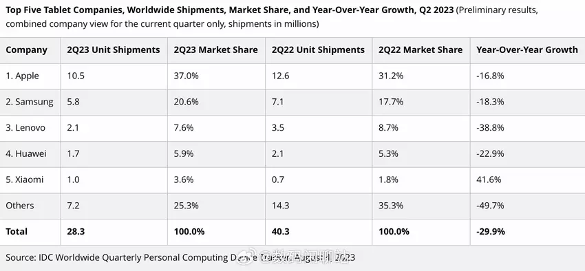 Apple blijft de tabletmarkt aanvoeren, ondanks het feit dat in het tweede kwartaal van 2023 de verkoop met 16,8% daalde ten opzichte van dezelfde periode in 2022. Het bedrijf uit Cupertino veroverde 37% van de markt en verkocht 10,5 miljoen apparaten.