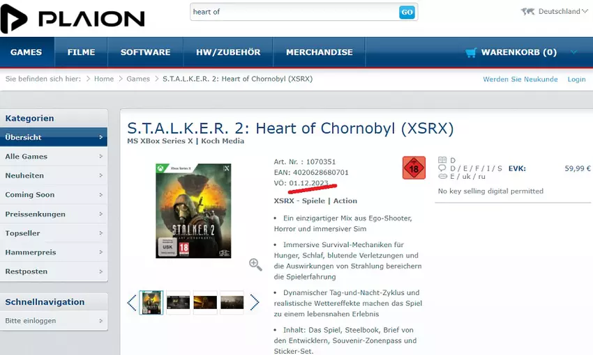 De release van S.T.A.L.K.E.R. 2: Heart of Chornobyl vindt mogelijk plaats op 1 december: een van de online winkels op de pagina van de shooter vermeldt deze datum
