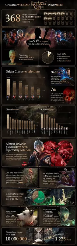 Ontwikkelaars van Larian Studios hebben een aantal interessante statistieken gepubliceerd over hoe spelers het eerste weekend na de release van Baldur's Gate III hebben doorgebracht.