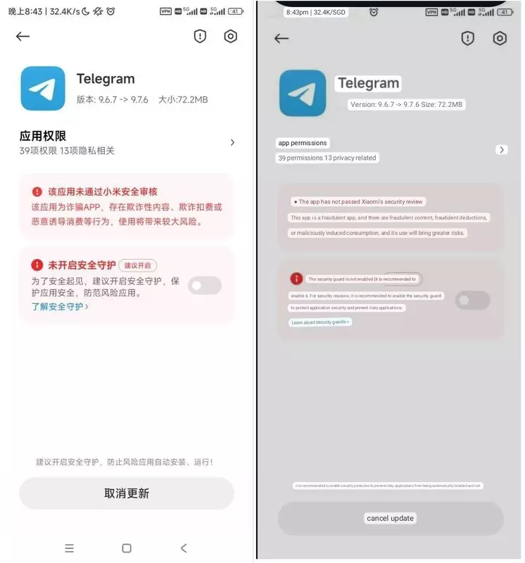 Nu classificeert MIUI de Telegram messenger als een gevaarlijke app. Als je hem probeert te installeren, geeft het systeem een melding dat de app niet door Xiaomi's beveiligingscontrole is gekomen en frauduleus is.