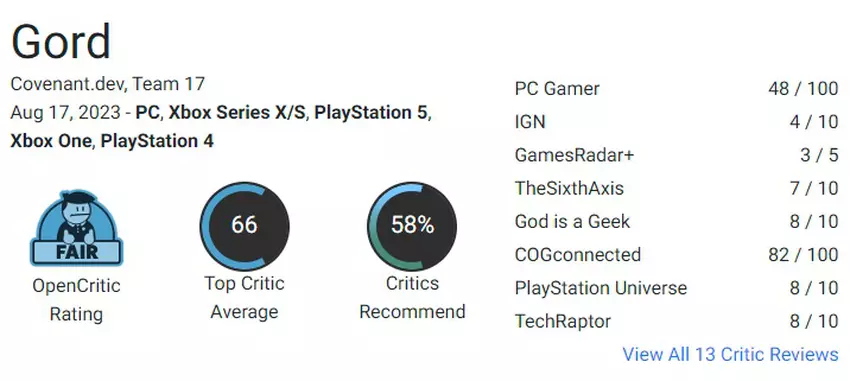 Zo krijgt de versie van Gord voor pc op Metacritic slechts 58 punten, terwijl de versie voor PlayStation 5 75 punten krijgt. Waarschijnlijk is zo'n groot verschil in scores te wijten aan technische problemen van het spel op pc's.