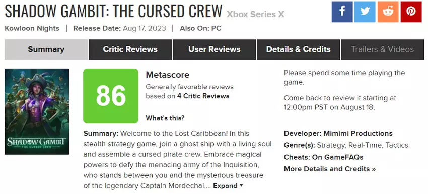 Het nieuwe project van Mimimi Games kreeg de volgende scores: