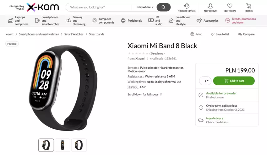 Een grote Poolse retailer heeft een productpagina op zijn website aangemaakt met details over de start van de verkoop. Toegegeven, de armband heet niet Xiaomi Smart Band 8, maar Mi Band 8. De pagina werd snel verwijderd, maar niet zo snel dat journalisten geen tijd hadden om een screenshot te maken.