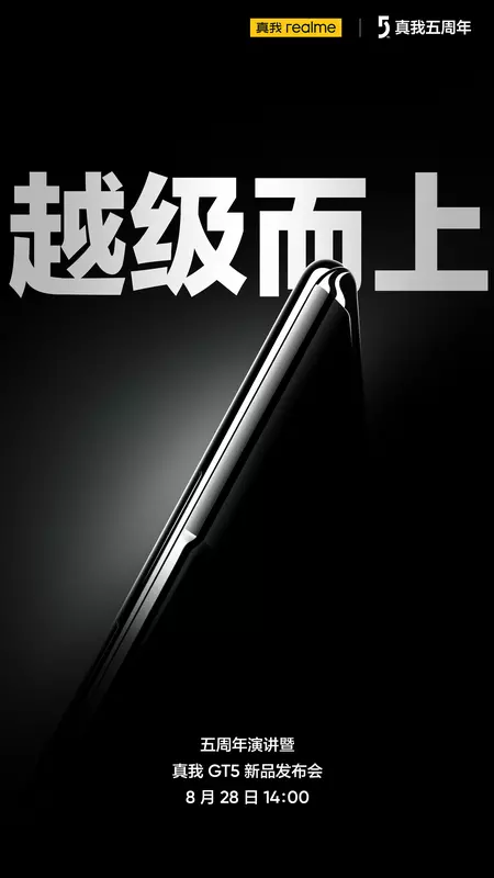 We hebben het over de realme GT 5. Volgens de officiële uitnodiging van de fabrikant op het sociale netwerk Weibo zal de nieuwigheid op 28 augustus worden getoond tijdens een evenement in China.