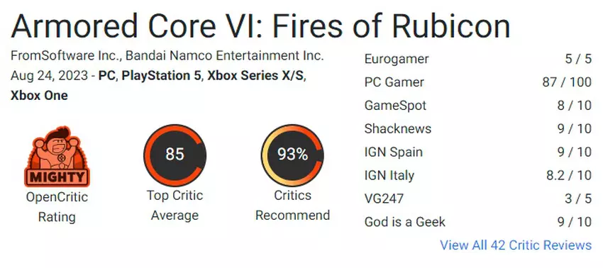 Armored Core VI: Fires of Rubicon actiegame krijgt hoge cijfers van critici. Fans van de franchise zullen blij zijn met FromSoftware's nieuwe game