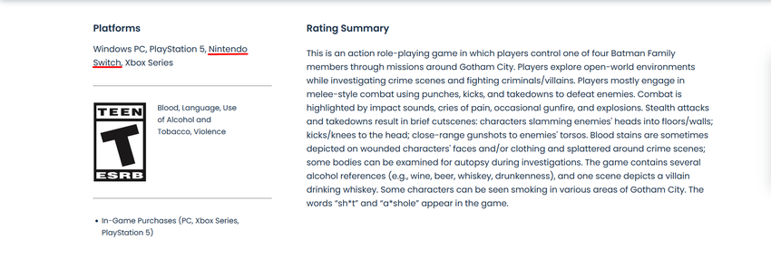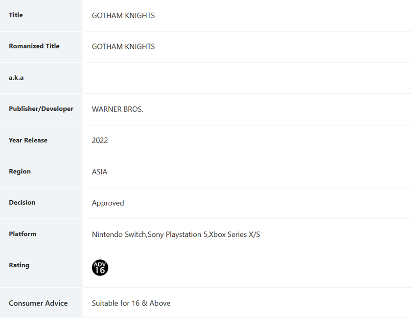 Dit wordt ook bevestigd door het feit dat er een vermelding van de Switch-versie van Gotham Knights verscheen op de website van de Singaporese overheidsinstantie. En het is onwaarschijnlijk dat gamers een cloudversie zullen vinden, aangezien de ESRB geen informatie bijwerkt over dergelijke versies van games.