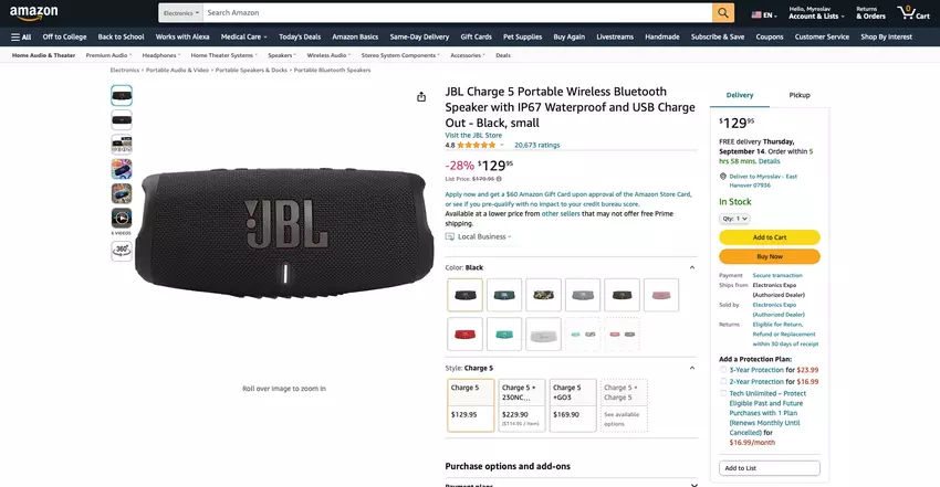 De gg redactie vond nog een geweldige aanbieding op Amazon - de JBL Charge 5 draadloze speaker voor $179.95. Er zijn negen kleuren beschikbaar.