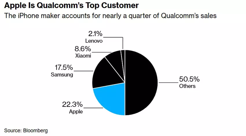 Ondertussen is het bedrijf uit Cupertino de grootste klant van Qualcomm. Apple is goed voor 22,3 procent van de totale omzet van de Amerikaanse chipmaker. De top drie wordt gevormd door Samsung (17,5%) en Xiaomi (8,6%).