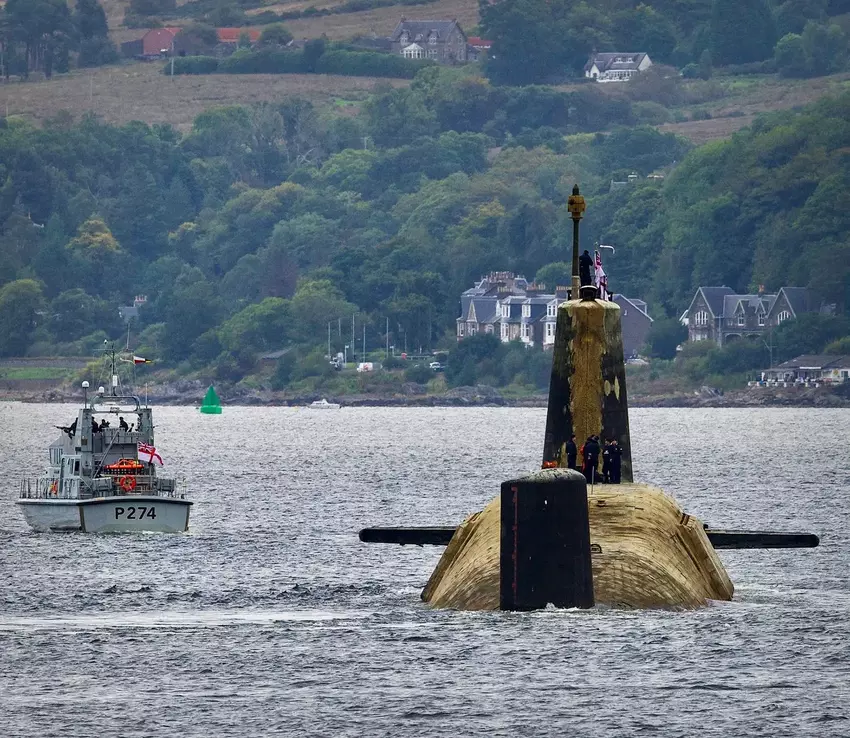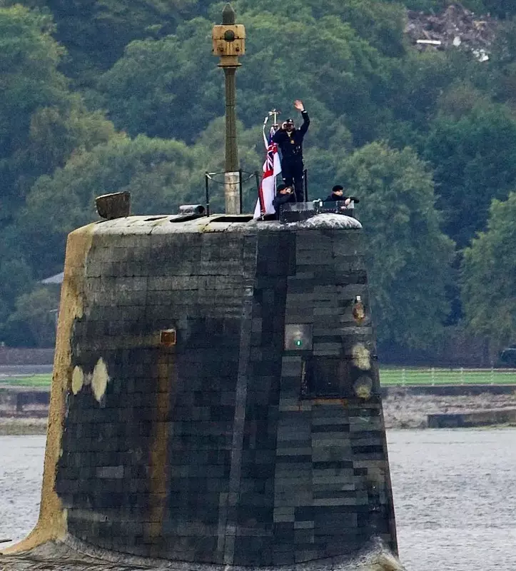 De foto's werden genomen tijdens de terugkeer van de nucleaire onderzeeër naar de Clyde Naval Base in Schotland. De Britse Royal Navy heeft in totaal vier Vanguard-klasse onderzeeërs in dienst met Trident II (D5) intercontinentale ballistische raketten die kernkoppen kunnen dragen.