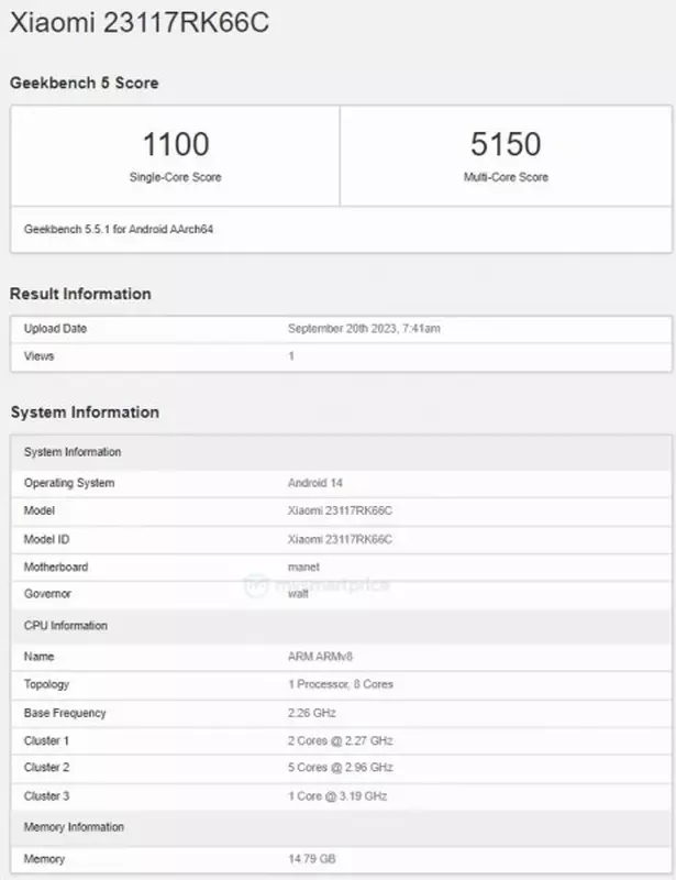 De smartphone heeft modelnummer 23117RK66C. Hij is niet getest in Geekbench 6.1, maar in een oudere versie van de benchmark, v5.5. Het resultaat in de test Single-Core was 1100 punten, en in Multi-Core scoorde het model 5150 punten.