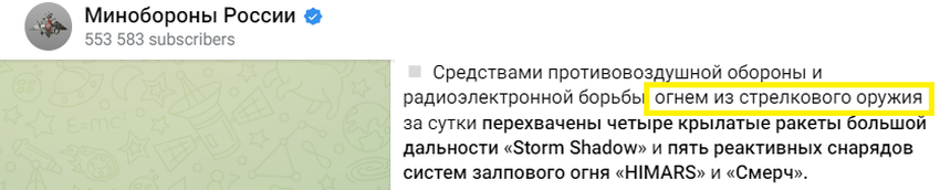 Het ministerie van Defensie van de Russische Federatie heeft de dag ervoor een zeer vreemde verklaring afgelegd. In het dagelijkse rapport stond dat militairen begonnen waren met het gebruik van kleine wapens om kruisraketten en geleide raketten te onderscheppen.
