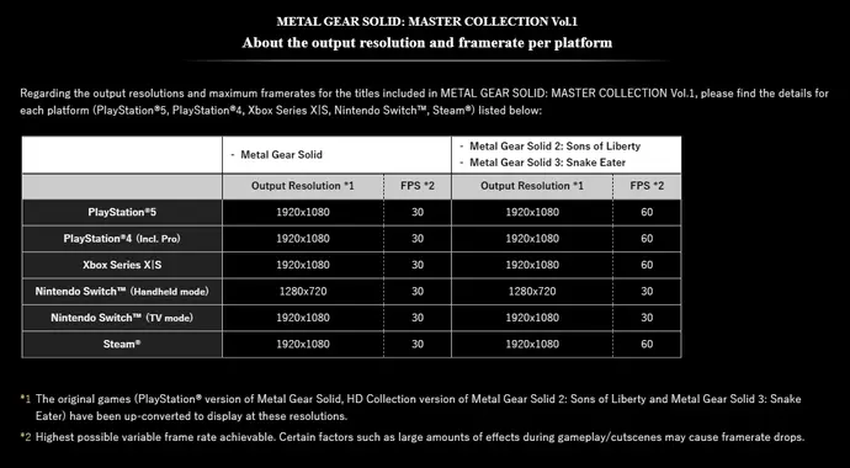 Ik wil je eraan herinneren dat de collectie de eerste drie games van de Metal Gear Solid-serie bevat, samen met uitbreidingen. Konami heeft onlangs informatie gepubliceerd over de resolutie en framerate voor deze drie games op verschillende platforms:
