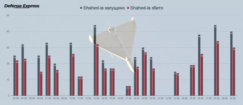 Volgens Defence Express vuurde Rusland in september een recordaantal van 503 UAV's af op het grondgebied van Oekraïne. Ter vergelijking: daarvoor was het record 413 drones (voor mei 2023). Ondanks zo'n groot aantal drones kon de Oekraïense luchtverdediging 396 doelen vernietigen. Dat wil zeggen dat de effectiviteit van de luchtverdediging 78,7% is.