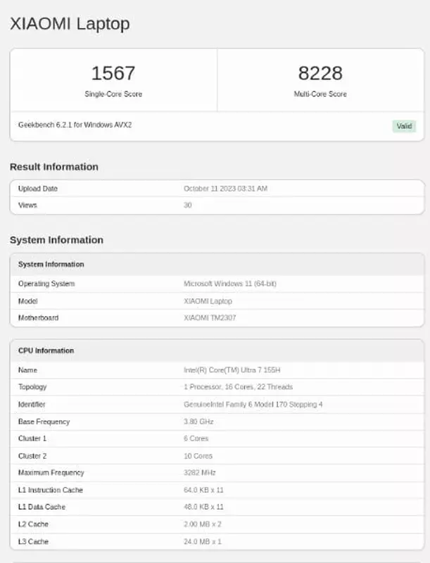 Onze collega's van Gizmochina hebben de nieuwe laptop van het bedrijf gespot in een Geekbench-prestatietest. Volgens het lek wordt de gadget aangedreven door een nieuwe 14e generatie Intel Core Ultra 7 155H (ook bekend als Intel Meteor Lake) processor. De chip krijgt 16 kernen met 22 threads. Hiervan zijn er 6 prestatiekernen en 10 efficiënte kernen. Het apparaat wordt ook geleverd met 32 GB RAM en Windows 11 besturingssysteem.