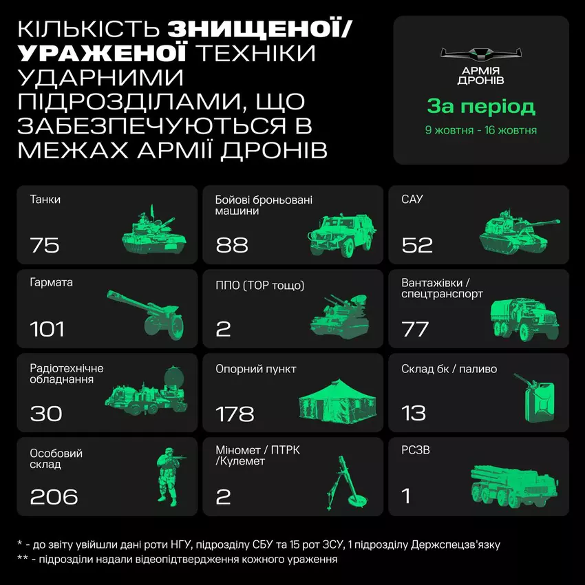Het gaat om 75 tanks, 88 pantservoertuigen, 52 zelfrijdende artilleriesystemen, 101 kanonnen, 2 luchtverdedigingssystemen, 77 vrachtwagens, 30 eenheden radioapparatuur, 178 bolwerken, 13 opslagplaatsen met munitie en brandstof, 2 machinegeweren/mortieren en 1 meervoudige raketwerper. Daarnaast werden drones gebruikt om 206 vijandelijke manschappen te vernietigen.