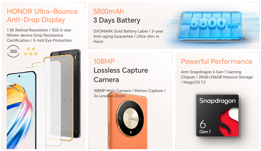 Het toestel heeft de naam Honor X9b gekregen. De nieuwigheid heeft een 6,78-inch scherm met AMOLED-matrix, FHD+ resolutie en 120Hz verversingssnelheid. De gadget draait op een Snapdragon 6 Gen 1-processor in combinatie met 12 GB RAM en 256 GB ROM. De nieuwigheid is ook uitgerust met een 5800 mAh batterij met 35W opladen, een 108 MP + 5 MP + 2 MP hoofdcamera en een 16 MP frontcamera. Het toestel wordt geleverd met Android 13-besturingssysteem en MagicOS 7.2-schil.