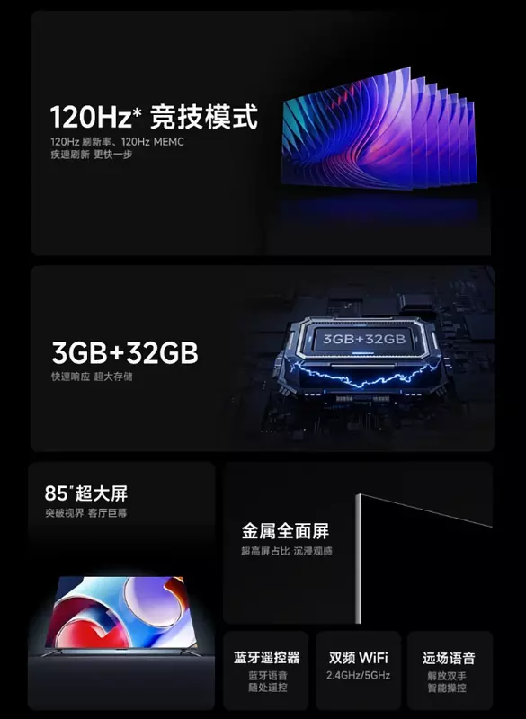 De nieuwigheid kreeg de naam Xiaomi TV A Pro 85. De gadget heeft een 85-inch scherm met EMMC-technologie en een vernieuwingsfrequentie van 120 Hz. Het paneel heeft een 4K-resolutie en biedt ondersteuning voor 1,07 miljard kleuren en dunne frames. De TV wordt geleverd met 10-watt stereoluidsprekers, HDMI- en USB-poorten, Wi-Fi en Bluetooth 5.0. De nieuwigheid wordt geleverd met 3GB RAM en 32GB ingebouwde opslagruimte. Xiaomi TV A Pro 85 wordt aangedreven door een quad-core Cortex-A55-processor.