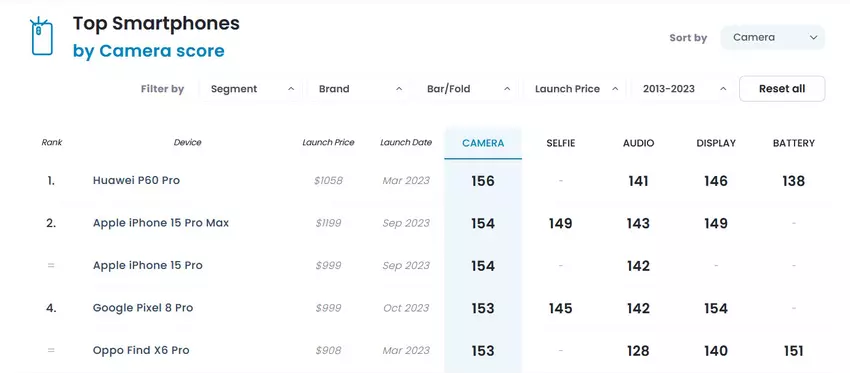 Tegelijkertijd staat de Pixel 8 Pro niet ver achter de top drie: iPhone 15 Pro (154 punten), iPhone 15 Pro Max (ook 154 punten) en Huawei P60 Pro, die de leiding heeft met 156 punten.
