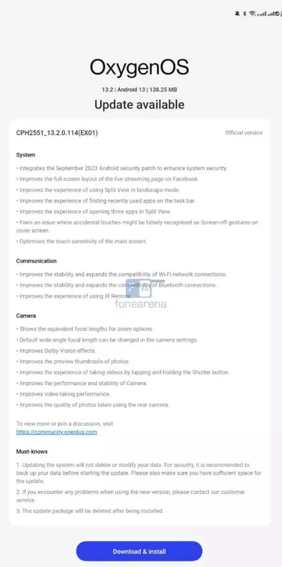 De firmware heeft buildnummer CPH2551_13.2.0.114(EX01) en weegt 138 MB. Het systeem is al in golven uitgerold naar apparaten.