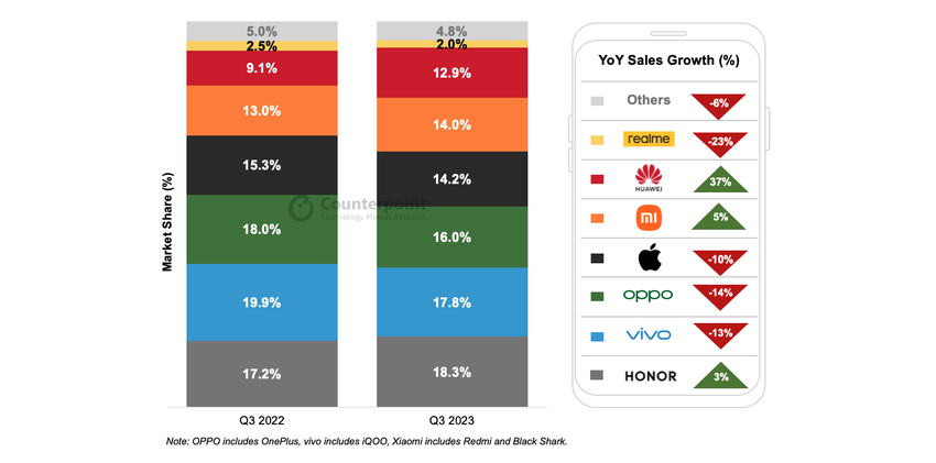 Huawei steeg de verkoop van smartphones in China met 37 procent, terwijl Apple, OOPO, vivo en realme het lieten afweten in Q3 2023