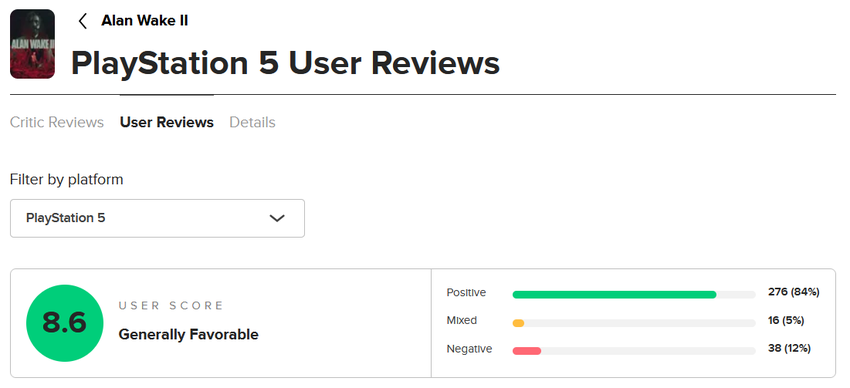Op Metacritic beoordelen spelers de game op een 10-puntsschaal, en Alan Wake 2 kreeg een 8,6. Slechts 12% van de beoordelingen is negatief en nog eens 5% is gemengd. En 84% van de gamers zegt dat Remedy een van de beste games van dit jaar heeft uitgebracht. De enige negatieve aspecten van de positieve recensies zijn visuele bugs en de slechte lokalisatie van sommige talen, waaronder Oekraïens.