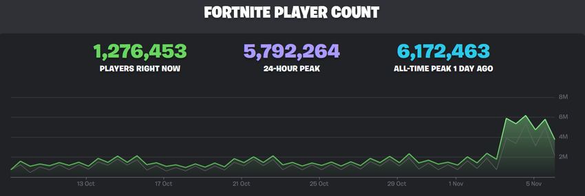 Epic Games meldde dat 4 november de grootste dag in de geschiedenis van Fortnite was. Toen deden 44,7 miljoen spelers mee aan het spel en speelden 102 miljoen uur. Maar daar houden de records niet op, want volgens fortnite.gg heeft de battle royale een nieuw online hoogtepunt bereikt van 6.172.463 spelers.