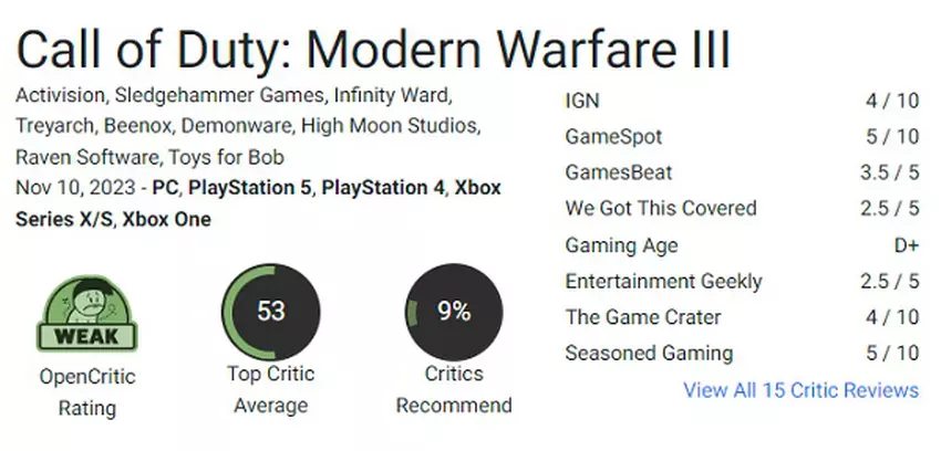 Zo'n lage waardering zou niet verrassend moeten zijn, want zoals we al hebben gemeld, was Call of Duty: Modern Warfare III (2023) slechts 16 maanden in ontwikkeling, wat rampzalig kort is voor een project van dit niveau. Het is trouwens geen geheim dat de shooter oorspronkelijk was gepland als een add-on voor de game uit 2022.