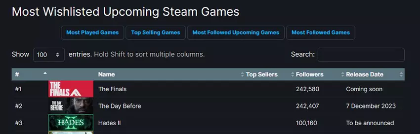 In het document wordt opgemerkt dat de shooter The Finals de top 5 van populairste games op Steam heeft bereikt en de leider is geworden in het aantal toevoegingen aan het verlanglijstje van deze service, zoals bevestigd door de SteamDB-service.
