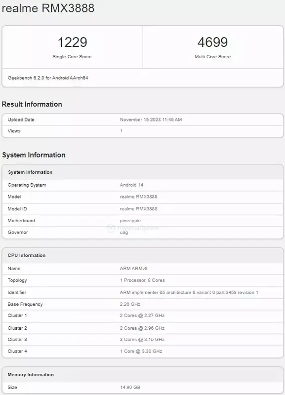 De prestatietest werd doorstaan door de versie met 16 GB RAM. Benchmark bevestigt dat de realme GT 5 Pro een Qualcomm Snapdragon 8 Gen 3 mobiele processor en Android 14 besturingssysteem heeft. Het resultaat was een score van 1229 in Single-Core en 4699 in Multi-Core.